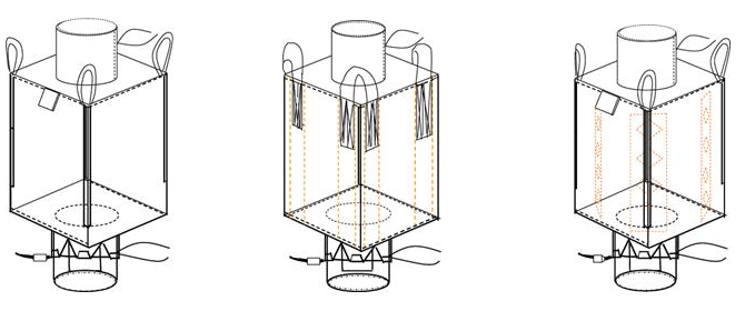 一,集裝袋的結(jié)構(gòu)樣式主要有3種,從左到右依次為U型片設(shè)計、圓筒型設(shè)計、隔板型設(shè)計。