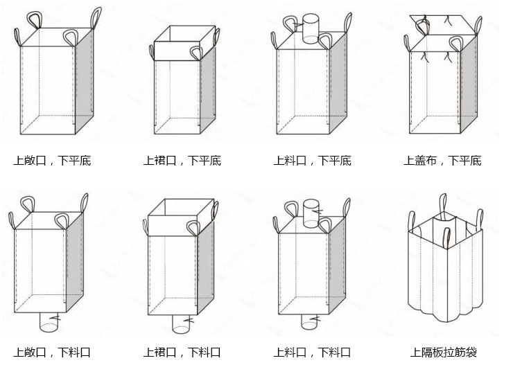 集裝袋的樣式多種多樣,可以根據(jù)客戶的實際要求來進行定制,但是它的標(biāo)準(zhǔn)樣式一般有以下幾種,下面給大家初略講解下。